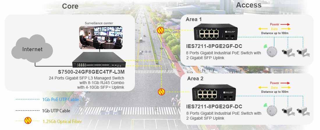 The IES7211-8PGE2GF-DC offers two Gigabit SFP optical uplink ports, enabling high-speed, long-distance fiber connections to your core network.