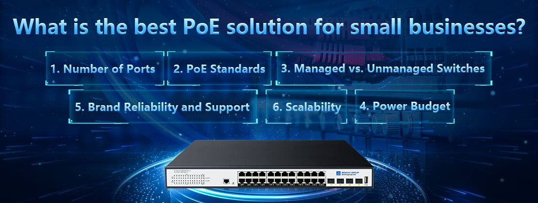 The best Power over Ethernet (PoE) solution for small businesses depends on the specific needs of the network, such as the number of devices, the type of devices (IP cameras, VoIP phones, wireless access points), and power requirements. Here are some key factors and recommended options to consider when choosing a PoE solution for small businesses: